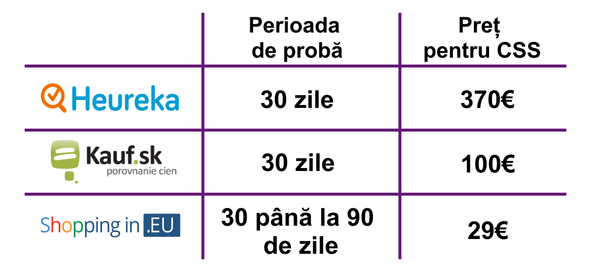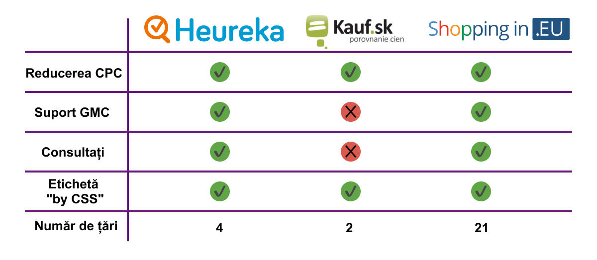 Cum putem observa, Heureka oferă tot ceea ce poate oferi un partener CSS, la fel și noi. Pe de altă parte, Kauf nu oferă suport pentru Google Merchant Center și nici consultanță în ceea ce privește campaniile Google Ads.